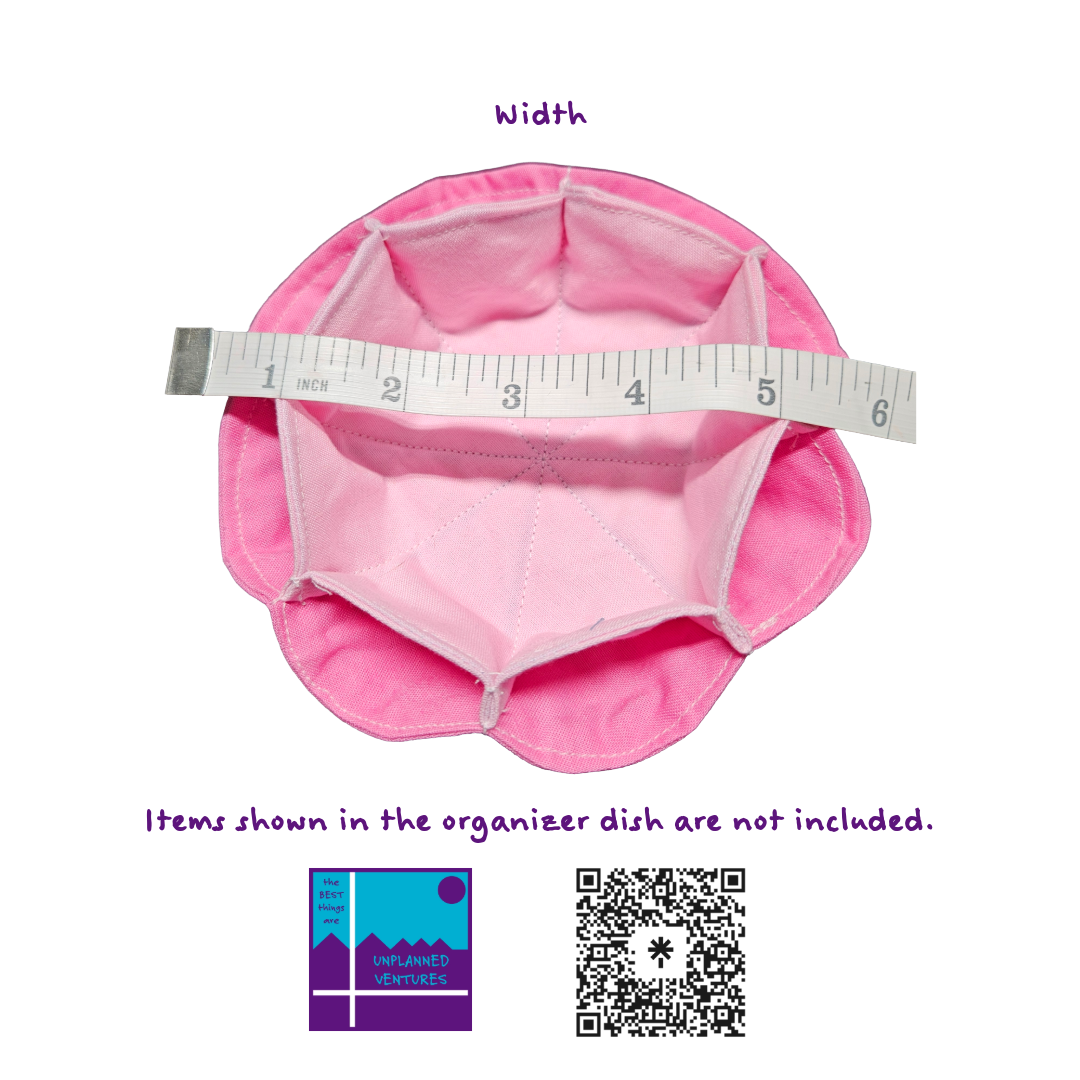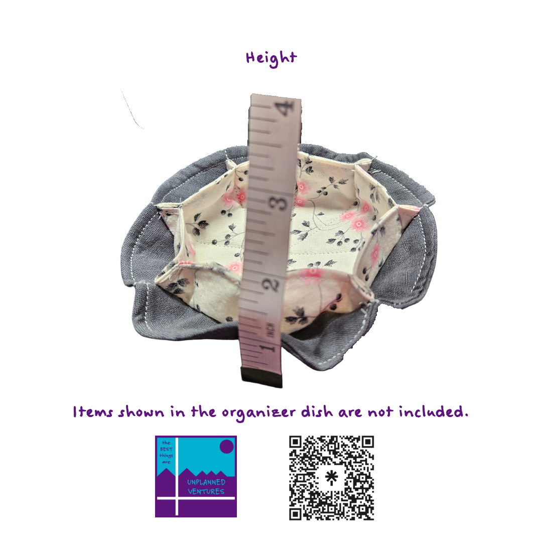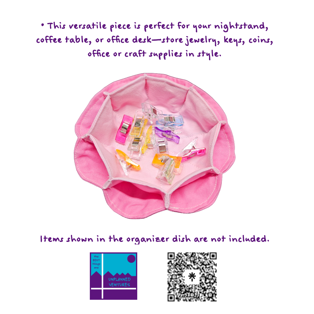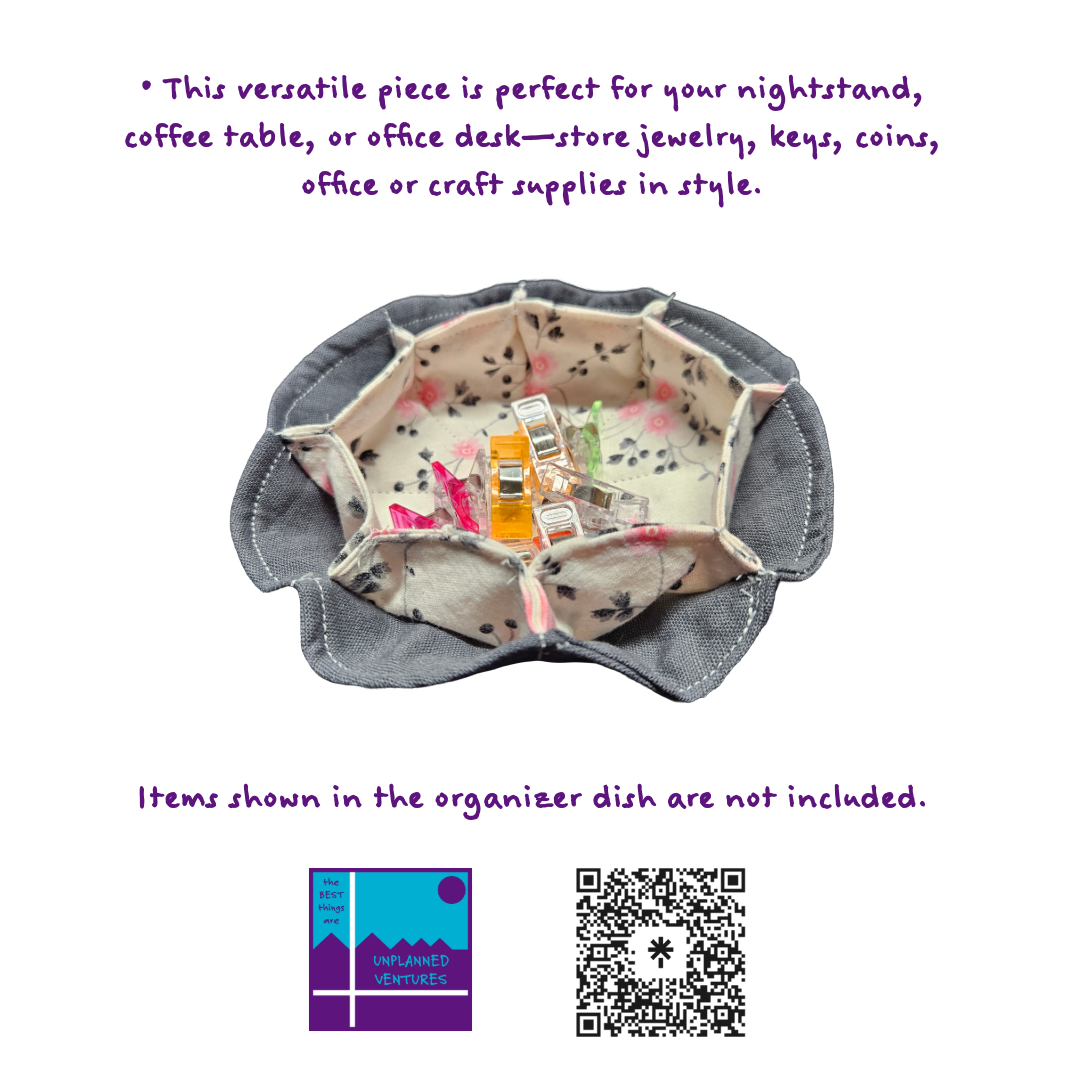 Upgrade your organization with our handcrafted cotton fabric organizer dish, measuring approximately 5 inches in diameter and featuring 8 convenient outside cubbies plus 1 spacious inside cubby (about 3 inches wide). This versatile piece is perfect for your nightstand, coffee table, or office desk—store jewelry, keys, coins, or office supplies in style. Each dish is soft, durable, and thoughtfully designed for everyday use.