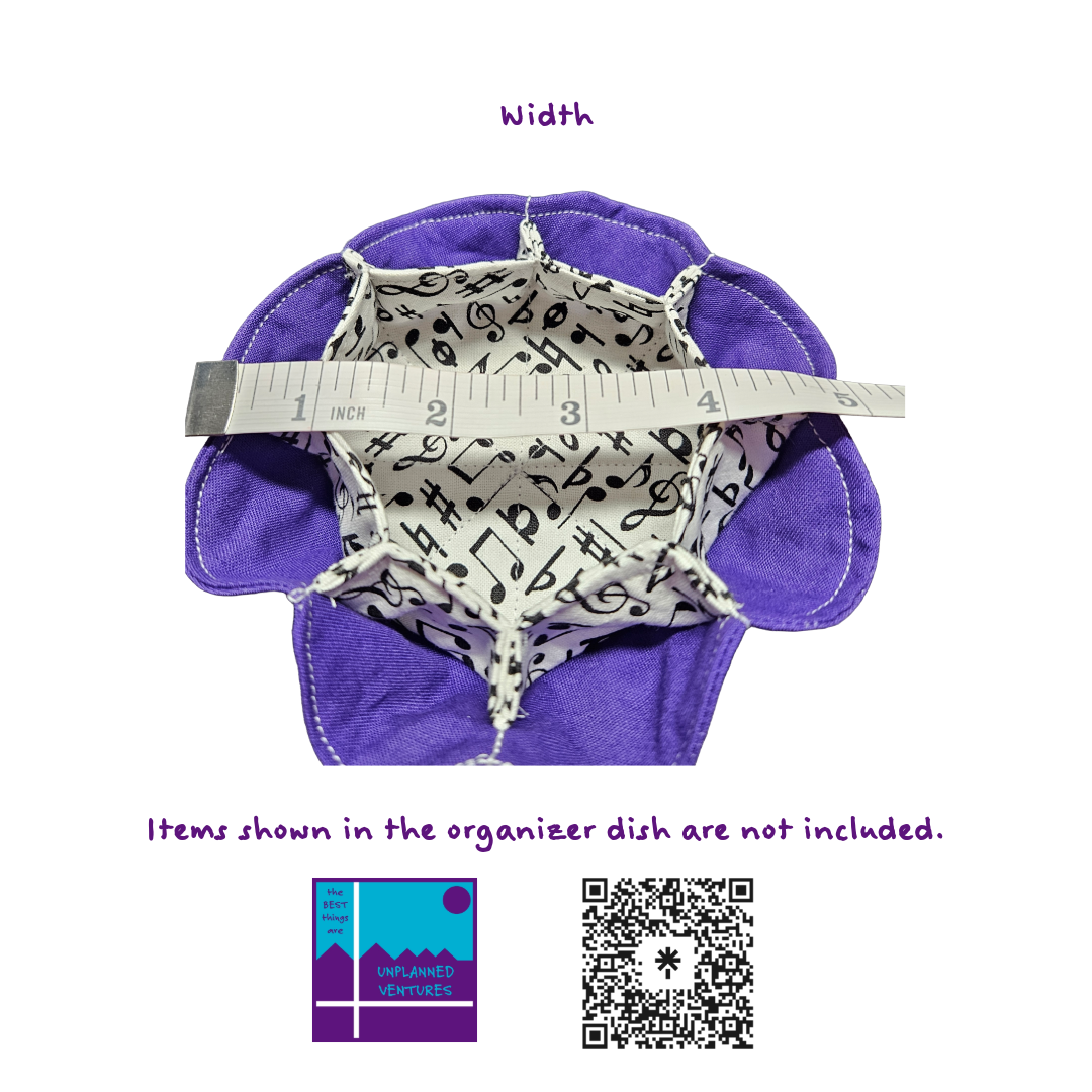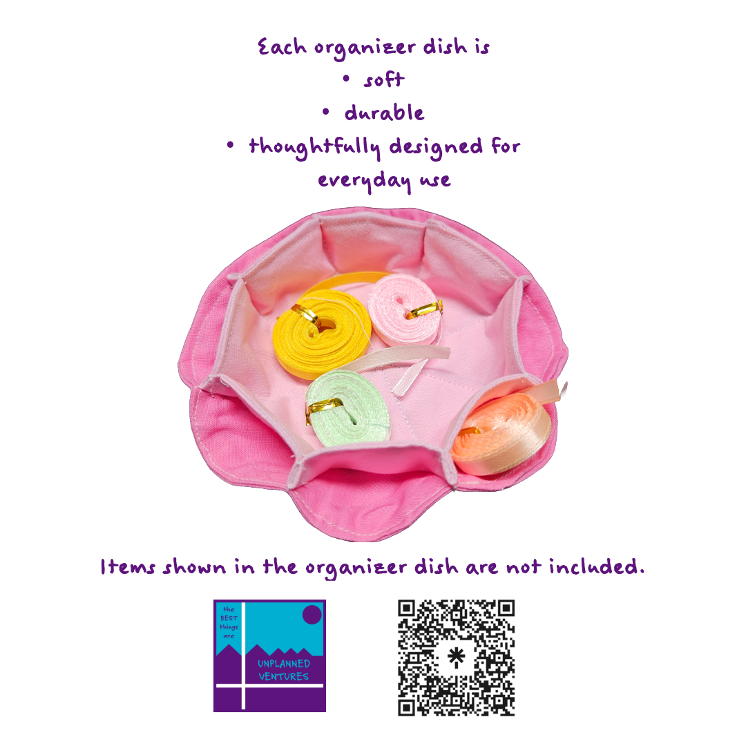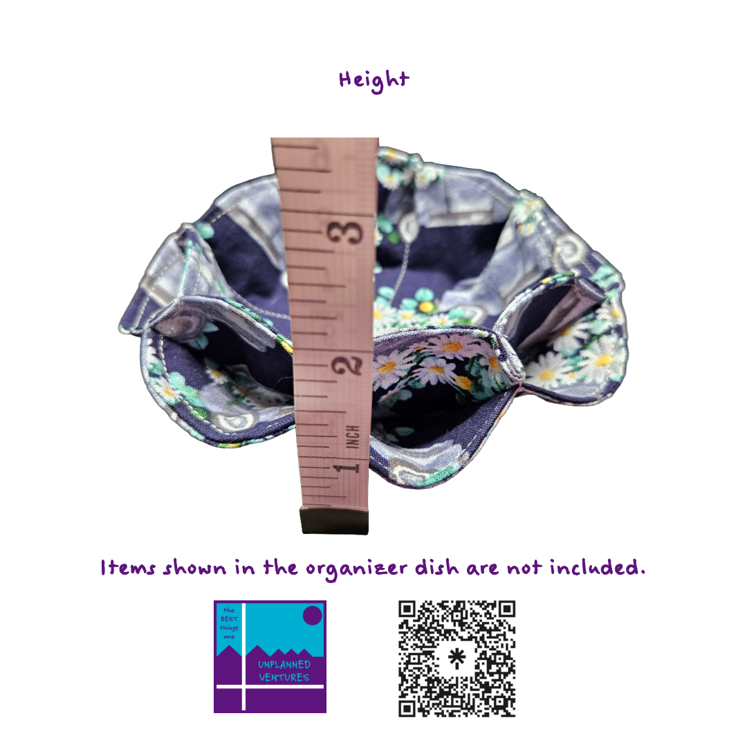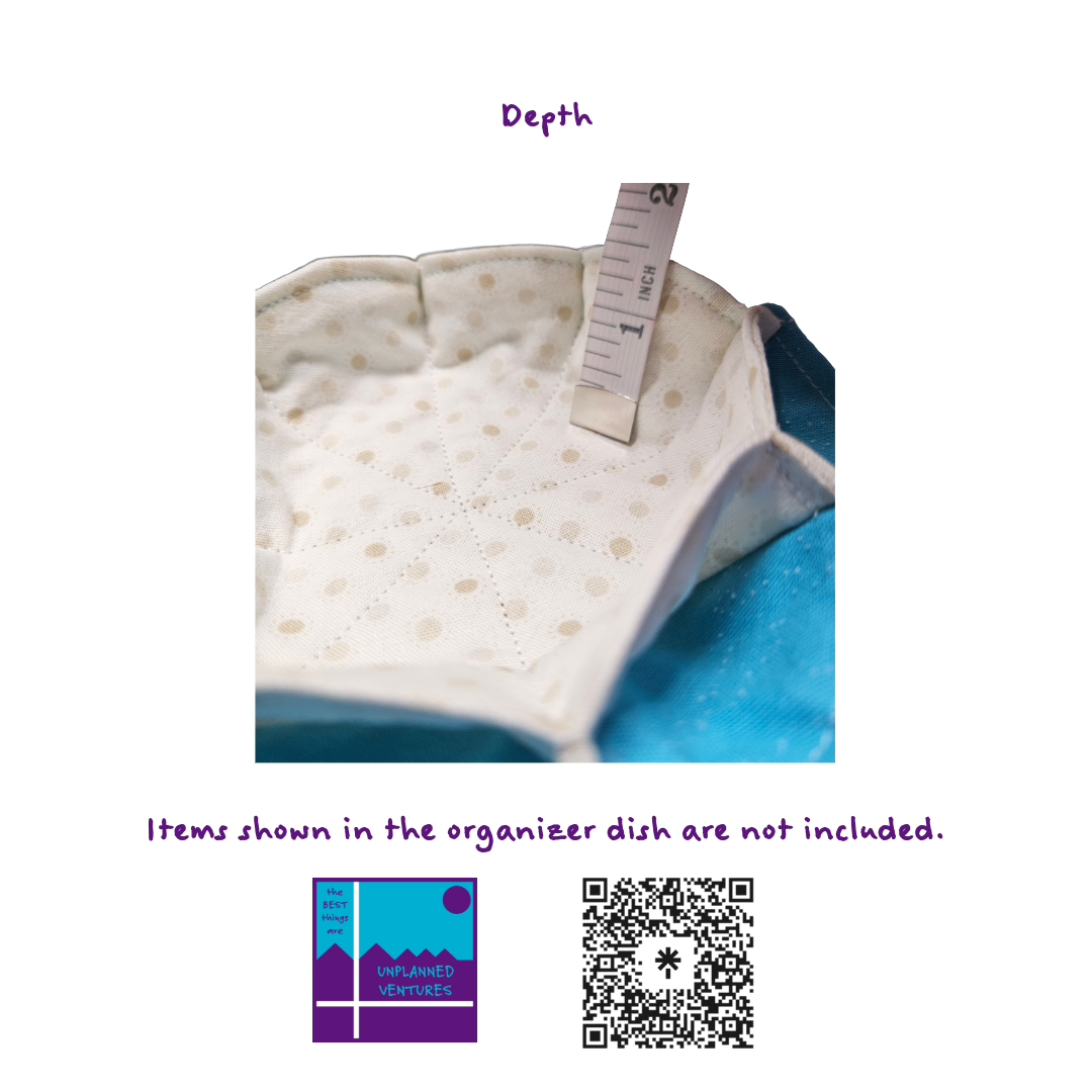 Upgrade your organization with our handcrafted cotton fabric organizer dish, measuring approximately 5 inches in diameter and featuring 8 convenient outside cubbies plus 1 spacious inside cubby (about 3 inches wide). This versatile piece is perfect for your nightstand, coffee table, or office desk—store jewelry, keys, coins, or office supplies in style. Each dish is soft, durable, and thoughtfully designed for everyday use.