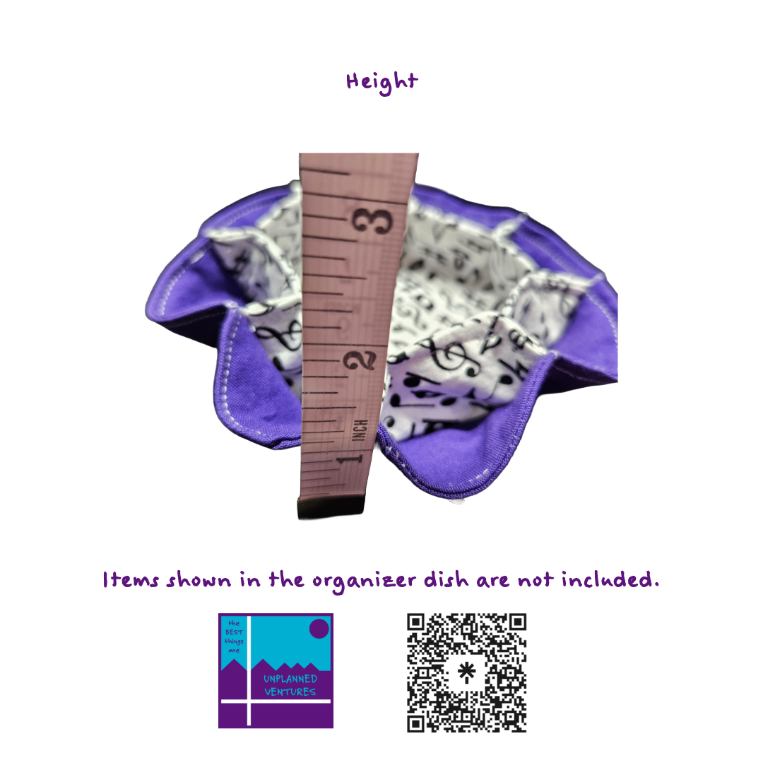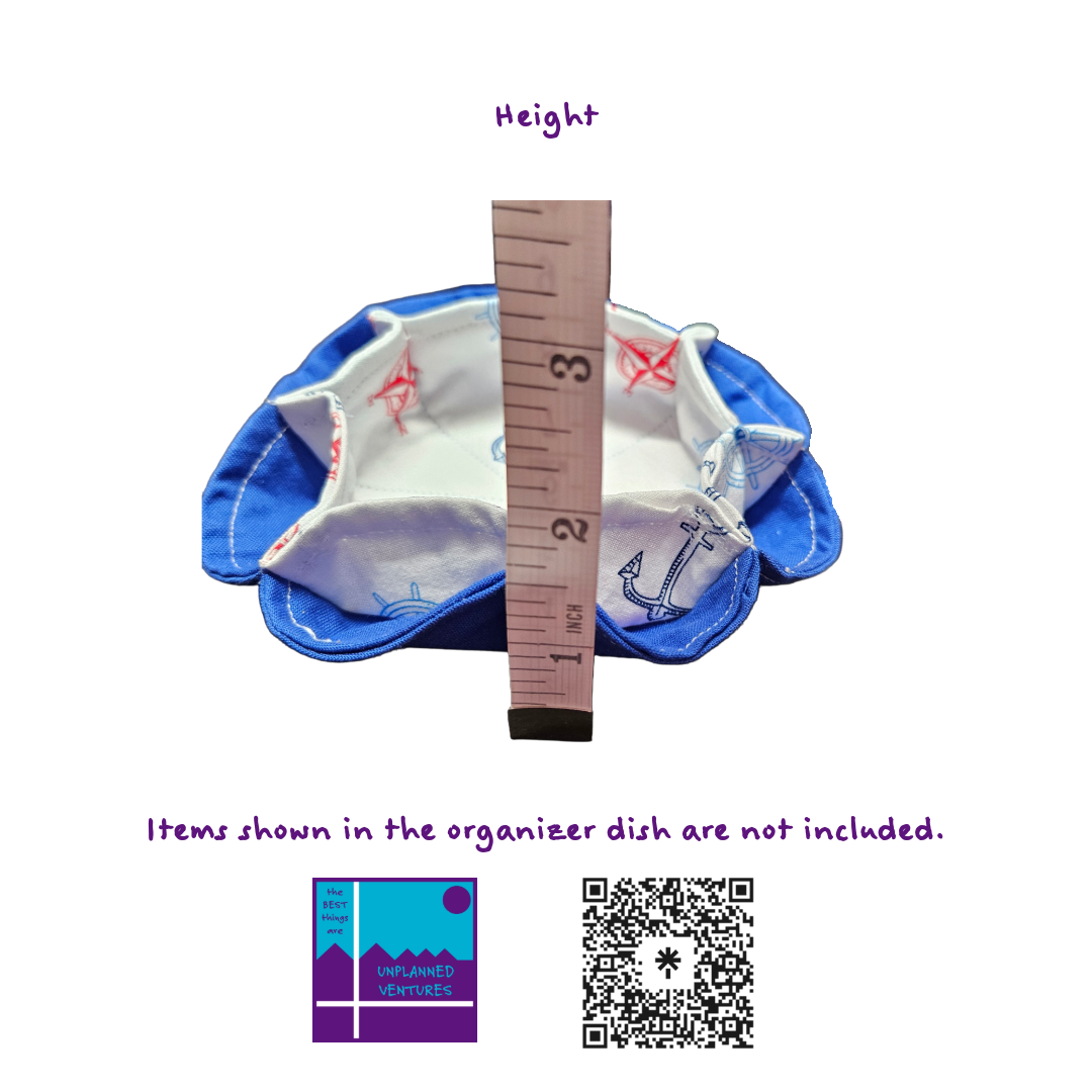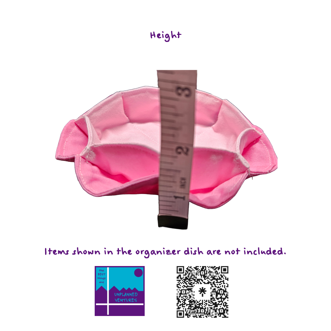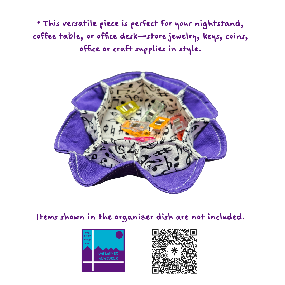 Upgrade your organization with our handcrafted cotton fabric organizer dish, measuring approximately 5 inches in diameter and featuring 8 convenient outside cubbies plus 1 spacious inside cubby (about 3 inches wide). This versatile piece is perfect for your nightstand, coffee table, or office desk—store jewelry, keys, coins, or office supplies in style. Each dish is soft, durable, and thoughtfully designed for everyday use.
