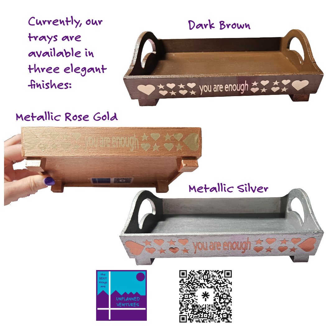 Need a decorative tray for your accessories? These are perfect for you! They take up very minimal space! Currently available in acrylic outdoor brown paint, metallic rose gold, and metallic silver. Each has a permanent vinyl saying of "You are enough". We have large and small trays. Some trays have an oval opening, others have a half C opening for the handles. All wood trays have a polyacrylic sealer on it to help protect them. If you would like to custom order yours, feel free to reach out and we can design a set just for you!